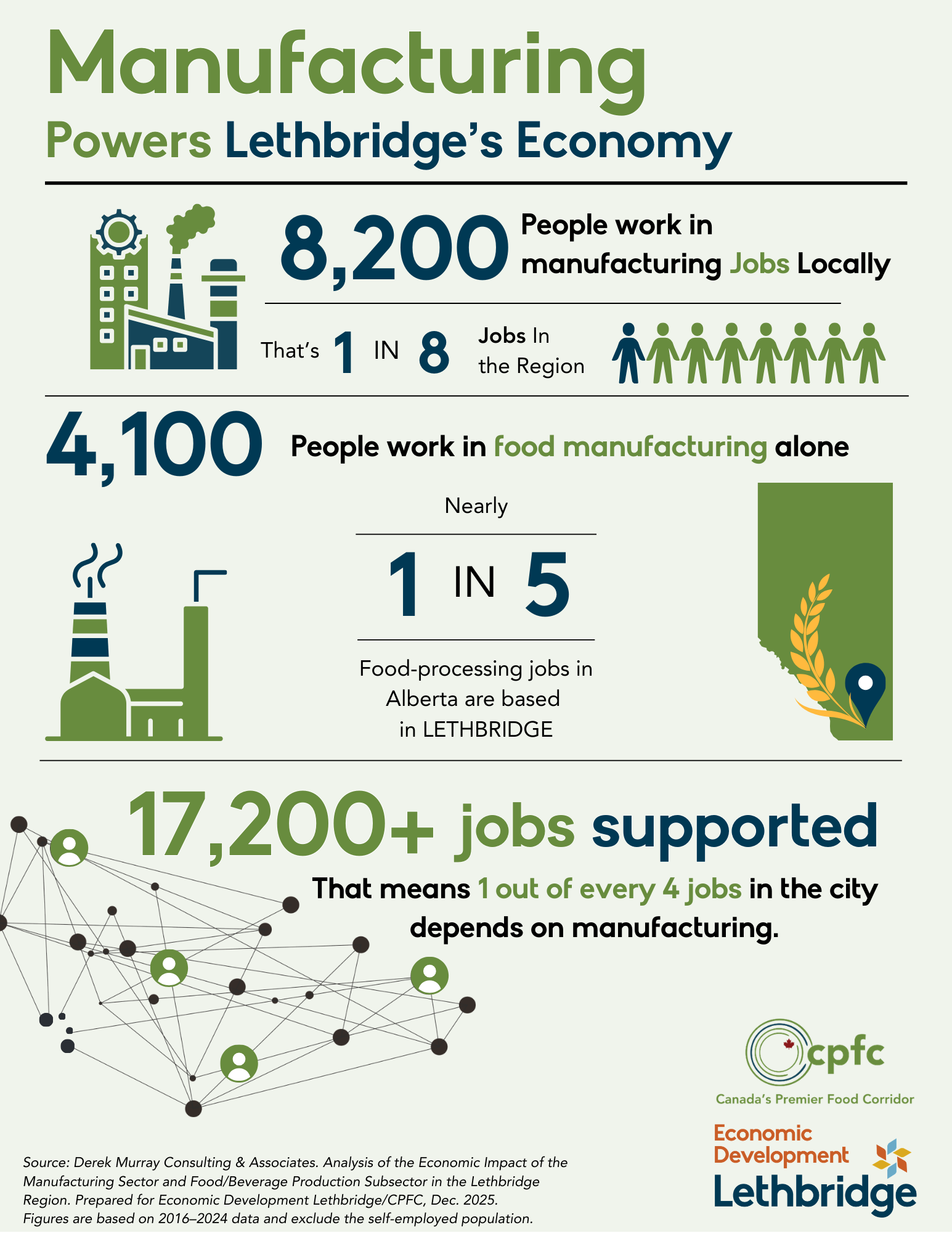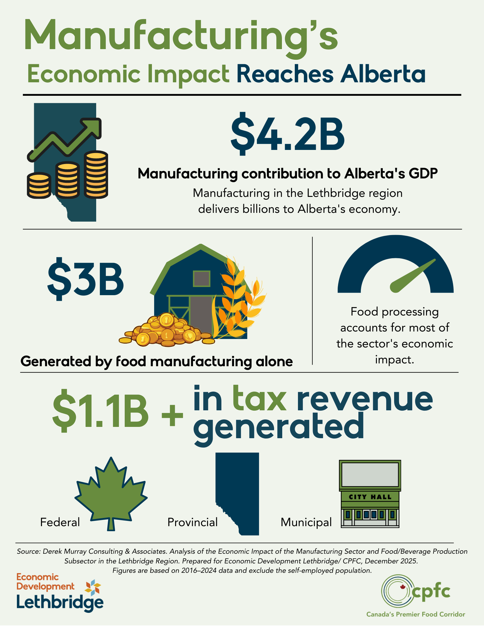 This report was prepared for Economic Development Lethbridge and Canada’s Premier Food Corridor using Statistics Canada data and economic modelling. Figures are based on 2016–2024 data. Employment numbers reflect payroll employees and do not include self-employed individuals unless otherwise noted. Results are estimates intended to provide a high-level view of economic impact.